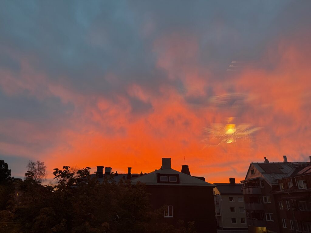 Jag gör middag och anstränger mig då jag fyller padrones med en färs jag mixat ihop. Det blir jättegott men då jag tar ut det från ugnen ser det ut som om jag plockat upp hundbajs med en grön påse. Tack och lov serveras det till pasta som tar bort större delen av hundbajs-illusionen. Vackrare än någonsin är nu kvällshimlen, ja den skapar balans på min middag och jag kan sova lugnt.